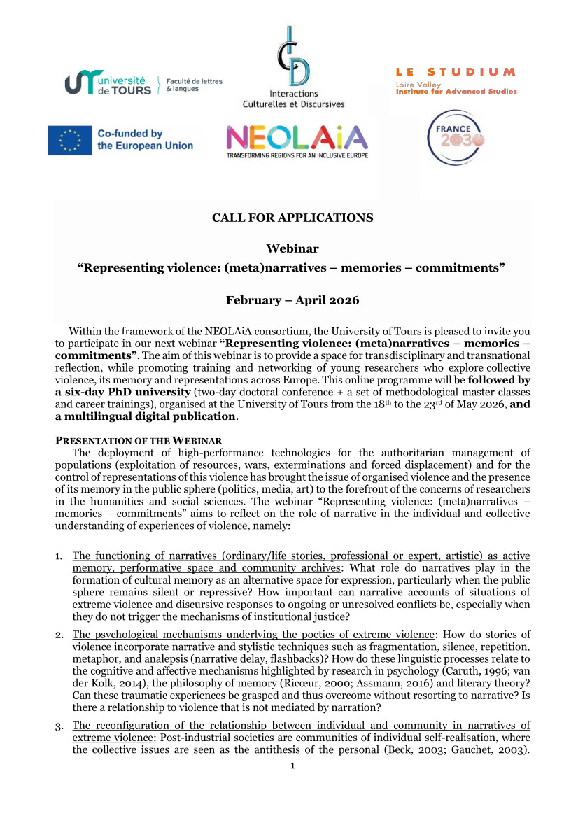 Nell'ambito del consorzio NEOLAiA, l'Università di Tours è lieta di invitarvi a partecipare al nostro prossimo webinar dal titolo “Rappresentare la violenza: (meta)narrazioni – memorie – impegni”. L'obiettivo di questo webinar è di fornire uno spazio di riflessione transdisciplinare e transnazionale, promuovendo al contempo la formazione e il networking di giovani ricercatori che studiano la violenza collettiva, la sua memoria e le sue rappresentazioni in Europa. Questo programma online sarà seguito da un corso di dottorato di sei giorni (due giorni di conferenza dottorale + una serie di master class metodologiche e corsi di formazione professionale), organizzato presso l'Università di Tours dal 18 al 23 maggio 2026, e da una pubblicazione digitale multilingue.