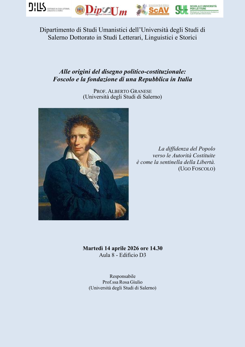 La rivista «Sinestesie» è lieta di segnalare la lezione dottorale del Prof. Alberto Granese, Università di Salerno, dal titolo: Le origini del disegno politico-costituzionale: Foscolo e la fondazione di una Repubblica in Italia che si terrà martedì 14 aprile, alle ore 14:30, in Aula 8, Edificio D3, Campus di Fisciano, Università di Salerno.